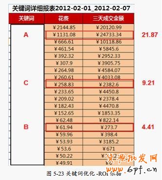 關鍵詞優(yōu)化的依據(jù)主要是關鍵詞的點擊率、關鍵詞轉化率和關鍵詞ROI(Return OnInvestment,投資回報率),這些指標直接影響這個關鍵詞對直通車推廣的有效性,其中關鍵詞ROI體現(xiàn)的是直通車推廣的直接效果,也就是說通過這個詞的推廣帶來的直接利潤。如圖5-20所示。