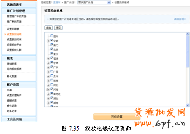你還可以使用設(shè)置投放地域這個功能,讓固定地域內(nèi)的買家才能看到你推廣的寶貝信息,不在地域投放內(nèi)的買家則看不到。你可以根據(jù)自己的物流情況或者流量來源,自行定義適合店鋪定位的投放地域內(nèi)容。這對一些地域性比較強的寶貝特別適用,如圖所示。
