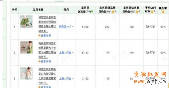 從圖上可以看出,上面兩個(gè)主推的款式,跳失率都達(dá)到了80%以上,說(shuō)明有80%的流量都浪費(fèi)掉了。這說(shuō)明了直通車流量還不夠精準(zhǔn),同時(shí),詳情頁(yè)面也做的不夠好。