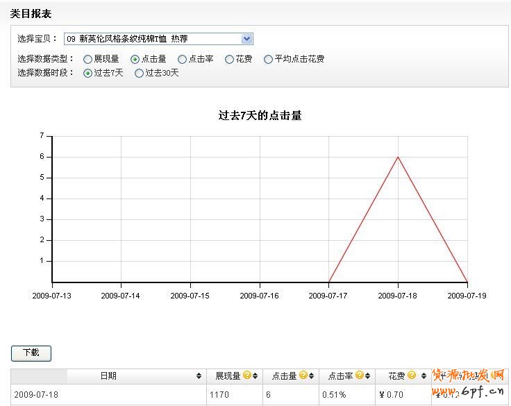 可以通過餅圖直觀地看到推廣寶貝中哪一個點擊量最多,更符合買家喜好,就是需要重點推廣的寶貝,也可以根據(jù)下面的表格根據(jù)點擊率、點擊量高低進行排序。而且也可以查看單個寶貝過去7天或者30天的變化趨勢,如果突然下跌,就要馬上去看看是不是下架了,關鍵詞和類目出價是不是要調整了。及時發(fā)現(xiàn)問題,及時做好改進。