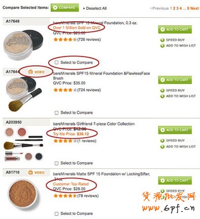 QVC化妝品站點(diǎn),它搜索結(jié)果展示的亮點(diǎn)是視頻內(nèi)容、對(duì)比工具、獨(dú)特的“Try Me Price”促銷價(jià)以及極具誘惑力的“Over 1 Million Sold”與“Custormer Favorite”導(dǎo)購(gòu)信息。