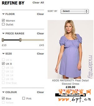 在每個(gè)子導(dǎo)航項(xiàng)后面,以括號(hào)()的形式顯示符合條件的結(jié)果數(shù)量,也是不錯(cuò)的做法。這一點(diǎn)值得學(xué)習(xí)的是ASOS.com,通過(guò)衣服幾個(gè)屬性的同時(shí)過(guò)濾篩選,通過(guò)AJAX技術(shù)異步,無(wú)須刷新既可加載展示符合條件的衣服。