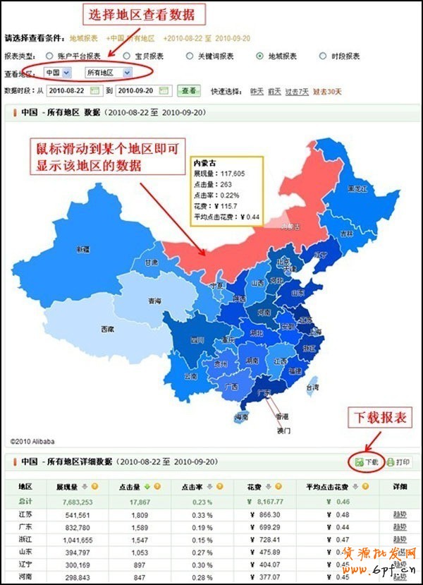 • 類目搜索,定向搜索都是以特殊關(guān)鍵詞形式存在于關(guān)鍵詞報(bào)表內(nèi),但是這個(gè)在此處是無法改價(jià)格的。 e. 地域報(bào)表您可以根據(jù)選定的地區(qū)和時(shí)間段,查看直通車的推廣數(shù)據(jù)。圖表區(qū)根以地圖形式展現(xiàn)不同地區(qū)的花費(fèi)、點(diǎn)擊量、展現(xiàn)量等數(shù)據(jù)?!霸敿?xì)報(bào)表” 為用戶提供不同地區(qū)的詳細(xì)推廣數(shù)據(jù)。點(diǎn)擊“查看-趨勢(shì)”,會(huì)彈出相應(yīng)的地域趨勢(shì)頁(yè)面。還可以下載和打印詳細(xì)報(bào)表。