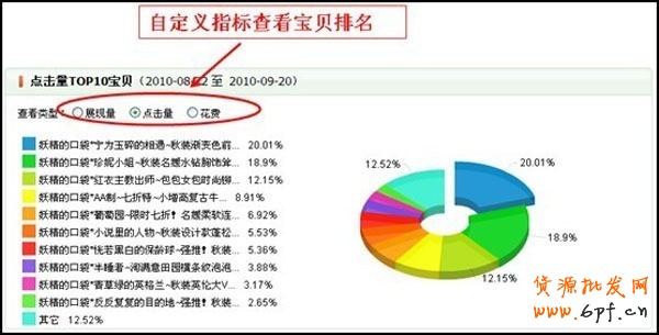 • (2) Top10寶貝 “TOP10寶貝”為用戶提供不同數(shù)據(jù)指標(biāo)排行TOP10的寶貝。您可以自定義單選查看不同的數(shù)據(jù)指標(biāo)。