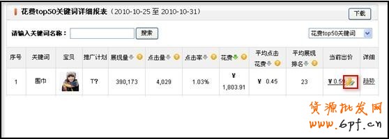 • (3) Top50寶貝詳細(xì)報(bào)表 “Top50寶貝詳細(xì)報(bào)表” 為用戶提供不同數(shù)據(jù)指標(biāo)排行TOP50的寶貝詳細(xì)數(shù)據(jù),用戶可以選擇查看點(diǎn)擊量top50寶貝、展現(xiàn)量top50寶貝、點(diǎn)擊量為0寶貝等數(shù)據(jù),還可以輸入寶貝名進(jìn)行相應(yīng)寶貝的數(shù)據(jù)查詢。您點(diǎn)擊“更多關(guān)鍵詞”,可以查看寶貝下的全部關(guān)鍵詞數(shù)據(jù);還可以進(jìn)行指標(biāo)排序和下載詳細(xì)報(bào)表。