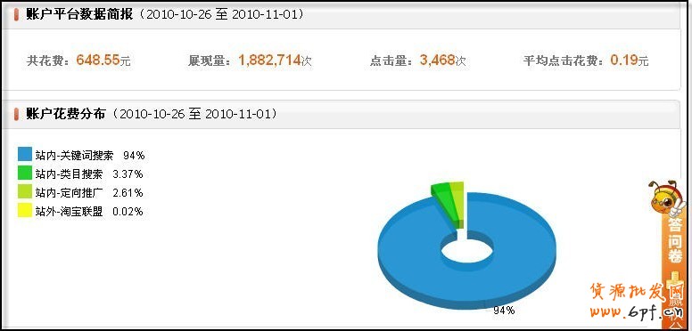 • (2) 賬戶花費(fèi)分布您可以查看所選時(shí)段的總花費(fèi)分別在“站內(nèi)-關(guān)鍵詞搜索、站內(nèi)-定向搜索、站內(nèi)-類目搜索”、站外—淘寶聯(lián)盟的分布。