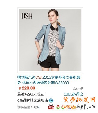 “韓版”風(fēng)格,這個產(chǎn)品的風(fēng)格屬性也定下了?!靶蓍e小西裝領(lǐng)短外套”,這組詞匯我之所以放在一起,既可以拆分成“休閑小西裝”“短外套”也可以拆分成“休閑 西裝”“短外套”也就是說,這個短語也覆蓋了很多的搜索信息。最后一組數(shù)字“W33030”是這個商品的貨號。其中覆蓋了現(xiàn)在的季節(jié)當(dāng)中以下熱搜詞匯“購物新風(fēng)尚”“韓版”“女裝”“2013”“西裝”“外套”等等熱搜詞匯。在這里,其實除了熱搜之外,商品的基本屬性表達(dá)的也很明確。這是大牌的做法,小賣家可以借鑒,但考慮到小賣家資金實力不夠,所以在設(shè)置商品屬性詞時,可以從小處著手,不像他們那么覆蓋廣,力求覆蓋精。