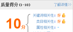 因此,質(zhì)量得分是關(guān)鍵詞的搜索匹配相關(guān)度的綜合指數(shù),當(dāng)買家搜索關(guān)鍵詞時(shí),匹配相關(guān)度越高的寶貝質(zhì)量得分越高,反之則越低。在關(guān)鍵詞出價(jià)相同的情況下,質(zhì)量得分越高,排名越靠前。推廣展示費(fèi)用越低。