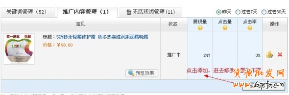 前期的主要用關鍵詞推廣,關鍵詞設置并不是越多越好,但是如果你有時間就可以多設置關鍵詞,關鍵詞一般要有效關鍵詞,如果你是小賣家,想節(jié)約資金,你可以多設置長尾關鍵詞,來精準推廣。關鍵詞管理比較麻煩,每天都要去無展現(xiàn)詞管理里面激活那些沒有展現(xiàn)量的詞,要不系統(tǒng)會把那些詞給刪掉。
