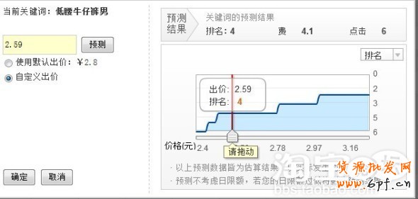 我出價2.8,但是排名你看看在哪里,所以這個詞對于一個不是爆款打造的計劃來說,基本沒戲,所以你得換個思路,通過組合也就是通常我們所說的找“長尾詞”,比如:牛仔褲 男/牛仔褲 休閑/牛仔褲 低腰。如果組合后你還你的出價還排不上名,還可以進一步組合,比如:牛仔褲 男 低腰。