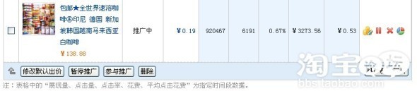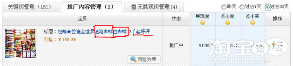 從上圖可以看出,關(guān)鍵詞“咖啡”出價(jià)是“0.89元”,質(zhì)量得分是“10分”,最后平均點(diǎn)擊費(fèi)用是“0.52元”,還是蠻劃算的吧!看看這款寶貝的推廣標(biāo)題(關(guān)鍵詞)是怎么寫: