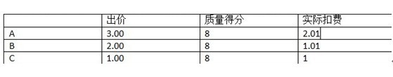 大家看表格1為什么拍第一,A的綜合排名是3*8=24,B的綜合排名是2*8=16,所以A排第一名。哪現(xiàn)在A的價(jià)格=B的出價(jià)XB的質(zhì)量得分/A質(zhì)量得分 + 0.01元,也就是2*8/8+0.01=2.01,接下來(lái)我們看下一個(gè)表格2