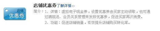 店鋪優(yōu)惠券:優(yōu)惠券在現(xiàn)實(shí)生活中應(yīng)用的比較廣泛,很多人的錢包里都會(huì)有各大商場(chǎng)抵價(jià)券,現(xiàn)金券,優(yōu)惠卡等等,可見這種方式還是比較受買家所歡迎的,在網(wǎng)上其實(shí)也一樣,我們送買家一個(gè)優(yōu)惠券,價(jià)格也不低,20元 30元的,如果買家不用的話,他就是感覺浪費(fèi)了很多東西,在下次購(gòu)物的時(shí)候就一定先到你的店里來看看,所以這是提升買家回頭率非常有效的一個(gè)方式。優(yōu)惠券的主要作用說白了優(yōu)就是為回頭客下餌,買家在我的店里買了物品我給他一張優(yōu)惠券,當(dāng)然在買家下次消費(fèi)的時(shí)候,肯定先來我的店里看看,達(dá)成了刺激再來;調(diào)動(dòng)消費(fèi)沖動(dòng)、因?yàn)榈謨r(jià)券是有時(shí)間限制的,例如一買家手里有一張馬上過期的抵價(jià)券,他可能就會(huì)馬上去買東西,把優(yōu)惠券用掉,現(xiàn)在在支付寶里做的這個(gè)優(yōu)惠券一般都是30天,過期就作廢了,調(diào)動(dòng)消費(fèi)沖動(dòng).