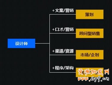 文字功底扎實,具備營銷思路的可以轉(zhuǎn)型做策劃;口才一流,又掌握營銷手段的,可以轉(zhuǎn)型做顧問型銷售;有供應商和媒介資源的可以轉(zhuǎn)型做市場或者企劃;有一定程序開發(fā)能力的或者前端架構的,可以轉(zhuǎn)型產(chǎn)品經(jīng)理;還有更多種不同的組合,而決定它的是設計師所擁有的知識。