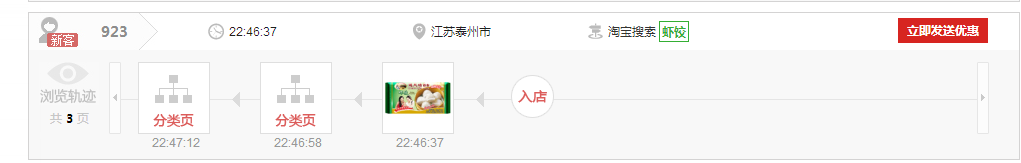 這里以本店為例,江蘇泰州市的客戶在淘寶中搜索蝦餃,從而進(jìn)入本店,先進(jìn)入了本店的避風(fēng)塘蝦餃,又通過(guò)分類頁(yè)訪問(wèn)了澳門豆撈,再通過(guò)分類頁(yè)進(jìn)行了二次跳轉(zhuǎn),訪問(wèn)了避風(fēng)塘點(diǎn)心。從這里,我們不但可以看到訪客的動(dòng)作,還可以對(duì)訪客進(jìn)行發(fā)送優(yōu)惠動(dòng)作,從而提高我們的顧客訪問(wèn)轉(zhuǎn)化率。