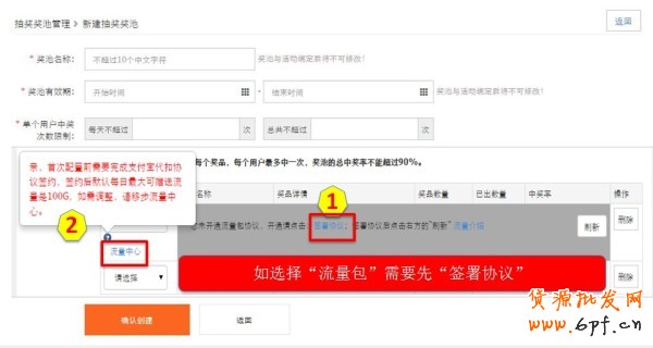 1. 寶箱右上角的創(chuàng)建獎池,進(jìn)入獎池,在獎品中下拉選擇流量包,首先會完成代扣協(xié)議簽約。