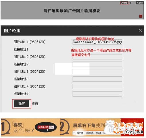 3、接著再添加一個“廣告橫幅”模塊,同時添加我們剛剛獲取的圖片鏈接到模塊里,然后點擊確定,具體的操作步驟如下圖: