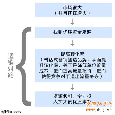 從傳統(tǒng)商業(yè)來(lái)說(shuō),就是找到最適合開店的區(qū)域,比如小區(qū)門口(找到優(yōu)質(zhì)流量來(lái)源);然后優(yōu)化產(chǎn)品組合,提升裝潢和店員水平(提高轉(zhuǎn)化率);最后瘋狂copy,瘋狂開店(資源傾斜,全力擴(kuò)大該優(yōu)質(zhì)來(lái)源)。