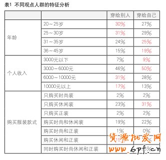 總體來看,對于穿衣的理念,消費者的觀點比較平均,52%的男性消費者認為衣服是穿給別人看的,48%的消費者認為衣服是穿給自己看的,穿給別人代表一種外向型的需求,而穿給自己代表一種內(nèi)向型的需求。從兩類人群的特征來看,外向型需求的人群更加年輕,收入相對更高,購買的服裝款式也更多,有著更強的服裝消費需求和更大的消費力;而內(nèi)向型需求的人群年紀較大,收入也相對較低,休閑裝就能很好地滿足他們的需要。(見表1)