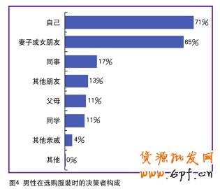 男裝的銷售,有31%是由女性購買的,說明了女性在男裝購買決策中的重要地位。同樣,從男性購買服裝的決策人來看,71%是自己決策,排在第二位的為妻子或女朋友,比例高達65%,說明絕大多數(shù)情況,女性都會參與到男裝的購買決策中。在進行產(chǎn)品設(shè)計、品牌宣傳和現(xiàn)場銷售時,都需要注意影響陪同購物的女性,品牌男裝不僅要吸引“男人”更要吸引“女人”。(見圖4)
