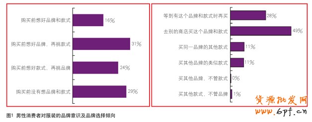 31%的男性消費者購買服裝時會提前想好要購買的品牌,然后再挑款式;甚至有16%的消費者在購買前將品牌和款式都已經(jīng)明確,可見,男裝消費者已經(jīng)形成了一定的品牌意識。從數(shù)據(jù)可以進一步看到,對于有品牌意識的消費者,如果沒有自己想要購買的品牌不會將就購買其他品牌,絕大部分消費者會選擇到別的店購買,更說明了男性消費者對品牌的忠誠度(用現(xiàn)在的話可以叫品牌粉絲)。(見圖1)