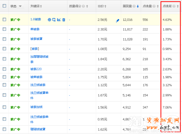 以關(guān)鍵詞“ 法蘭絨被套”為例 ,可發(fā)現(xiàn)影響點(diǎn)擊率幾個要點(diǎn):