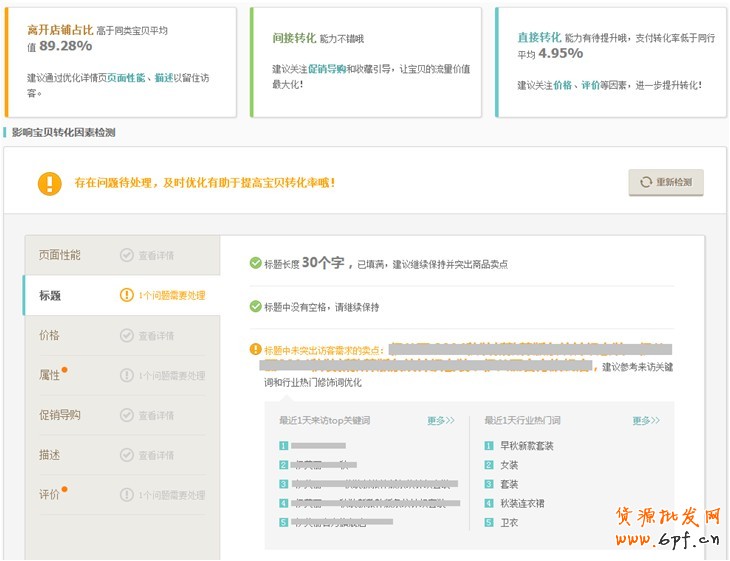 5)對重點關(guān)注的單品和轉(zhuǎn)化異常的單品,要從商品頁面的性能、標(biāo)題、價格等角度明確改進(jìn)措施。例如:標(biāo)題未突出來訪者關(guān)鍵需求點“修身”的,就要在標(biāo)題中可以添加該關(guān)鍵詞,商品描述中通過細(xì)節(jié)圖突出該賣點。