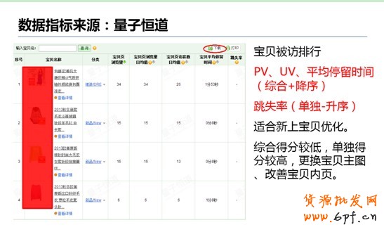 在量子恒道中,有一項(xiàng)“寶貝被訪排行”的功能,我們可以在這里獲取我們需要的數(shù)據(jù)。對(duì)于剛上架不久且零銷量的寶貝,建議選取的數(shù)據(jù)維度:PV、UV、平均停留時(shí)間,這些數(shù)據(jù)維度都是“往上走”的,帶有降序性質(zhì);最后還要單獨(dú)分析寶貝的跳失率。如果某款寶貝的總分值較低,而跳失率得分較高,說(shuō)明這款寶貝的內(nèi)頁(yè)需要進(jìn)行重點(diǎn)優(yōu)化。