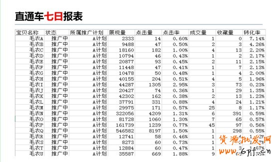 當(dāng)掌柜確定了這四個(gè)數(shù)據(jù)維度,就可以從店鋪的直通車后臺(tái)按這些數(shù)據(jù)維度,下載我們需要的數(shù)據(jù)報(bào)表。在時(shí)間上,掌柜最好選擇下載七日的報(bào)表,因?yàn)樽鳛橐豢钚缕穪?lái)說(shuō),7天的數(shù)據(jù)相比3天和30天更有時(shí)效性和準(zhǔn)確性。原始報(bào)表下載以后,掌柜只需刪除無(wú)用的信息,只保留寶貝名稱、點(diǎn)擊率、成交量、收藏量和轉(zhuǎn)化率,但是為了方便大家更好理解和有一個(gè)全局直觀的認(rèn)識(shí),我保留了狀態(tài)、所屬推廣計(jì)劃、展現(xiàn)量、點(diǎn)擊量這些維度的數(shù)據(jù)。