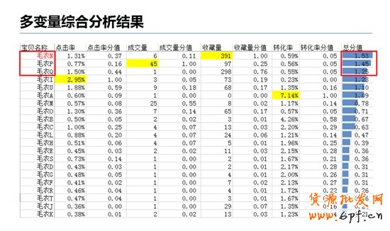 基于此理,我們也可以計(jì)算出店鋪寶貝毛衣A的綜合得分。但是否將毛衣A的點(diǎn)擊率、成交量、收藏量和轉(zhuǎn)化率相加即可得出呢?如果你將這四個(gè)維度的數(shù)值進(jìn)行相加,只會(huì)得到一個(gè)錯(cuò)誤的結(jié)果,因?yàn)槊總€(gè)維度的數(shù)值單位不同,是不能相加的。所以我們必須找到一個(gè)科學(xué)的計(jì)算方法,這就是下面將要講到的“多變量綜合評(píng)價(jià)法”。
