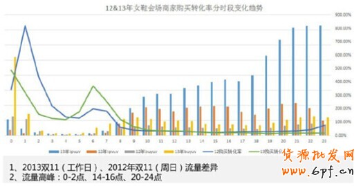 第二波的催付是針對已經在旺旺上進行了第一波催付但仍未付款的訂單。對于這些訂單,若我們人手不足,可以用催付短信進行二次催付。短信發(fā)放的時間如何安排?先來分析下去年的復盤數(shù)據就可以發(fā)現(xiàn)答案。(下圖:淘寶官方給出的女鞋類目會場商家雙11當天的成交分析(2013VS2012))