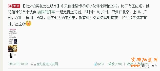 在七夕之際,紅娘“世紀佳緣”為自己牽了紅線,攜手快的打車送玫瑰花,這可真是“送人玫瑰,手留余香”??!其他婚介網(wǎng)站可以好好學學哦!