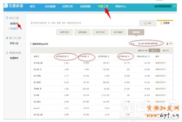 在“生意參謀”中的專題工具選擇選詞助手,點(diǎn)擊無線端選項(xiàng),就會(huì)出現(xiàn)無線端“全網(wǎng)搜索熱度”、“全網(wǎng)點(diǎn)擊率”、“全網(wǎng)轉(zhuǎn)化率”等相關(guān)點(diǎn)擊反饋數(shù)據(jù),我們可以從中挑選數(shù)據(jù)較好的關(guān)鍵詞添加到手機(jī)淘寶標(biāo)題中來。