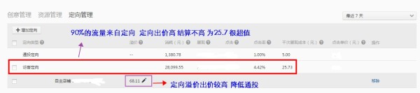 定向出價確實不低有68.11,但是競爭激烈,溢價需要這么出,看數(shù)據(jù)結果超值,通投只占到10%左右,最終定向的結算并沒有那么高