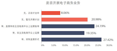 隨著品牌越來越重視電商渠道帶來的客戶資源,現(xiàn)在有70.96%的品牌表示開展了電子商務(wù)業(yè)務(wù)。其中27.42% 采取直營形式,19.35% 在主流電商平臺上運營,24.19% 既有直營,也在主流電商平臺上運營,品牌正在迅速的電商化。