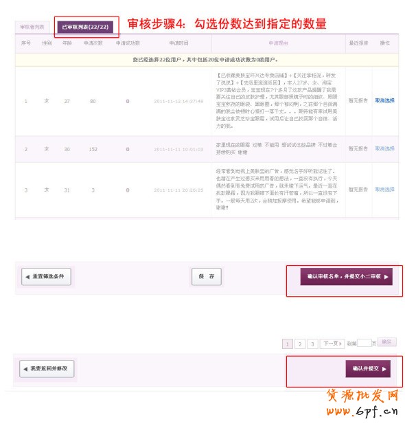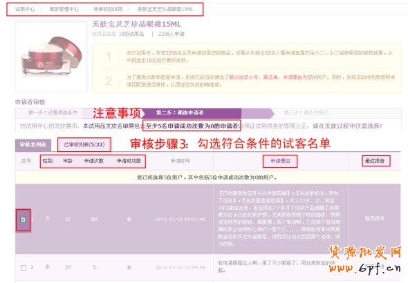 3、根據(jù)試客的性別、年齡、申請次數(shù)、申請成功數(shù)、申請理由、最近報告,勾選符合條件的試客名單