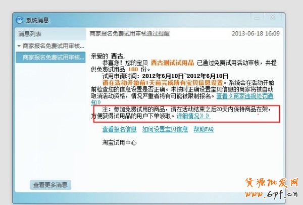 5、系統(tǒng)會在試客成功申請到試用品后,給試客發(fā)送旺旺彈窗和短信提醒。