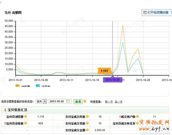 2、活動(dòng)前一天,返現(xiàn)試用開(kāi)始預(yù)告了,流量明顯上升,超過(guò)了1萬(wàn)大關(guān),銷(xiāo)售額沒(méi)有上去,但是活動(dòng)寶貝收藏量增加了151個(gè)。