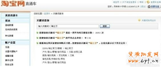 下面用到:淘寶直通車關(guān)鍵詞查詢功能。我們這里以上面選中的“瑞士刀”為例。