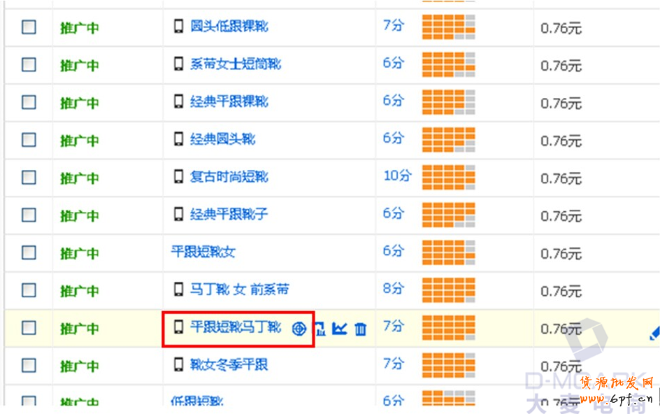 如上圖,“平跟短靴馬丁靴”這個(gè)關(guān)鍵詞屬性詞的“平跟”,核心詞“裸靴”、“馬丁靴”在寶貝標(biāo)題、淘寶/天貓直通車推廣標(biāo)題都含有,這樣的關(guān)鍵詞和寶貝的相關(guān)性就比較高,獲得手機(jī)標(biāo)識(shí)的機(jī)率就會(huì)大很多。