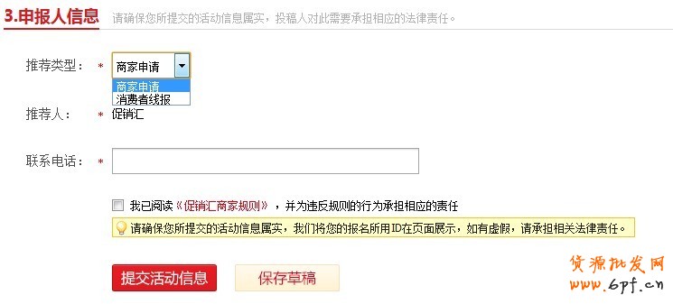 特別提示:以下所有內(nèi)容填寫請實(shí)事求是 ,不得夸大或出現(xiàn)與事實(shí)不符的信息,若有不實(shí),【促銷匯】將有權(quán)刪除所報(bào)名的活動情報(bào), 并把情報(bào)發(fā)布者的賬號加入黑名單。賬號一旦被加入黑名單,將無法再進(jìn)行活動推薦。
