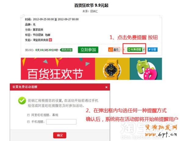 活動(dòng)開(kāi)始當(dāng)日,系統(tǒng)就會(huì)通過(guò)短信、旺旺通道提醒提前告知,讓你快速進(jìn)入所標(biāo)記的活動(dòng)頁(yè)面。