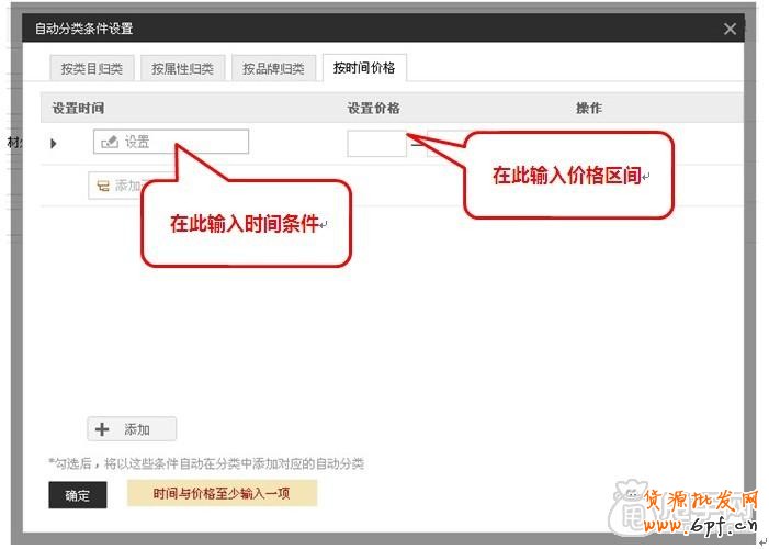 在設(shè)置按照時(shí)間價(jià)格分類的時(shí)候,時(shí)間和價(jià)格至少要輸入一樣,或者同時(shí)設(shè)置時(shí)間和價(jià)格條件