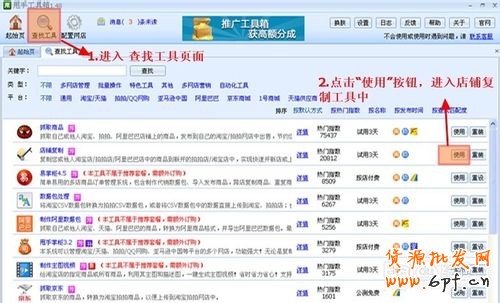 2、在甩手工具箱查找工具頁(yè)面找到店鋪復(fù)制工具,點(diǎn)擊后面的立即使用,會(huì)進(jìn)入店鋪復(fù)制工具中,如圖所示: