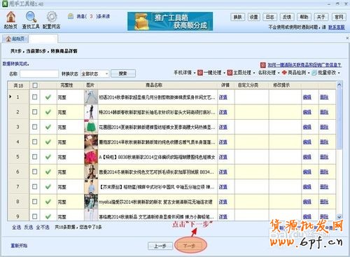查看商品詳情是否轉(zhuǎn)換正確,如出現(xiàn)屬性沒(méi)有轉(zhuǎn)化正確,可以根據(jù)提示批量編輯寶貝的屬性,然后點(diǎn)擊“下一步”如下圖所示: