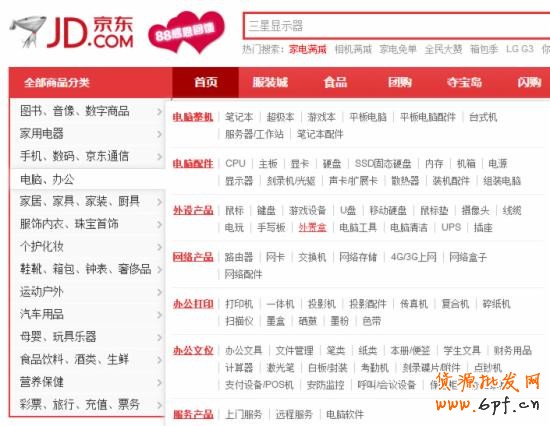 京東的網(wǎng)站在這一點上做的還是比較好的,每一個層級的導(dǎo)航顏色由深及淺,讓用戶有一種循序漸進(jìn)的感覺。整個導(dǎo)航區(qū)域的色彩搭配也很恰當(dāng),無論鼠標(biāo)懸停在任何地方,所在的位置都能反應(yīng)出一個比較舒適的頁面。