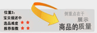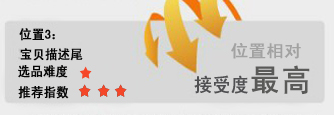 寶貝描述完以后插入關(guān)聯(lián)商品,這個位置相對接受度最高。首先,消費者能花費很長時間瀏覽寶貝描述,證明該消費者極其喜歡這款產(chǎn)品,購買欲望也相當(dāng)強烈。那在這個時候,加上相關(guān)產(chǎn)品、熱賣產(chǎn)品或者配套產(chǎn)品推介的時候,無論從點擊率、購買率來看,都是明顯提高的,也不容易造成反感。