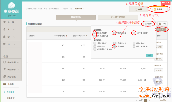 進入選詞助手后,我們先選擇查看無線端最近7天的關鍵詞。由于生意參謀限定只能選取5個指標,因此,我們選擇:帶來的訪客數(shù)、帶來的瀏覽量、引導下單買家數(shù)、引導下單轉化率和全網(wǎng)商品數(shù)5個指標。