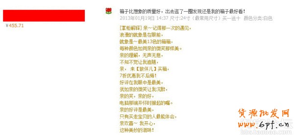 - 另外我們?cè)诎l(fā)出去的包裹里,都會(huì)放一封感謝信,感謝信的文案都是我們精心寫的,而且我們刻意買了很多好看顏色的打印紙來(lái)打印。顧客是上帝,人家肯光顧你店你是不是應(yīng)該感謝他,讓他記住你?如果一個(gè)人好不容易通過(guò)淘寶千千萬(wàn)萬(wàn)的賣家信息搜索到你店鋪來(lái)了進(jìn)行了一次購(gòu)物,你沒有一點(diǎn)可以讓他記住你的店鋪的好的地方,而是拼命的去催他確認(rèn)收貨給好評(píng),這樣的購(gòu)物,又何來(lái)的用戶體驗(yàn)?zāi)??記住,用戶體驗(yàn)不單單只是店鋪裝修好,界面設(shè)計(jì)的漂亮,用戶體驗(yàn)是從買家進(jìn)到你店鋪到收到貨以后你所進(jìn)行的服務(wù)整個(gè)一系列的!舉例說(shuō)明,一個(gè)香港的買家來(lái)我店里買拉桿箱,拉桿箱是屬于大物件,發(fā)到香港還只能發(fā)順豐,我特意咨詢了順豐的客服,也在順豐的網(wǎng)站上查詢了得出運(yùn)費(fèi)補(bǔ)差是180元,然后我也把順豐官網(wǎng)的價(jià)格結(jié)果截圖給買家看了,買家說(shuō)沒問題,付了180元運(yùn)費(fèi)給我,第二天我叫來(lái)順豐發(fā)件,順豐說(shuō)可以發(fā)到香港的經(jīng)濟(jì)快遞,慢兩天,但是可以便宜三分之一,我當(dāng)然二話不說(shuō)發(fā)便宜的,然后發(fā)好后馬上聯(lián)系香港的買家退六十元運(yùn)費(fèi)給她,她都感動(dòng)死了。這個(gè)買家如何感動(dòng)的,她都寫在評(píng)價(jià)里了,各位不信的去我店里的評(píng)價(jià)找這位香港買家的評(píng)價(jià)吧!