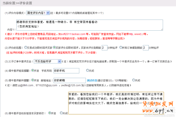 我們可以設(shè)置6個評價,在回評時隨機(jī)回評,那么就更加的個性了,省去了你一個一個去回評的精力。如果遇到買家一次性拍幾個訂單,并且都給中差評的,那么我們可以適時回敬他一下。能夠辨別到一個差評了,那么其他的訂單我們可以也回敬他一個差評,誰讓他這么壞呢??